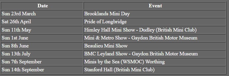 It has been a while since the 40 Register had its own displays at Mini shows in the UK. In 2023 & 2024 the Mini 40 Register joined up with the Cooper Sport 500 Register and 2000 Mini Register at some select shows, and this is also planned for 2025 as well. Below is a provisional list of shows the 'joint' registers will be present at, with all 40's welcome to join. If you are interested in coming along to any of the shows and joining the other like minded Mini owners in a display of 40's and final edition cars, email andy@mini40register.co.uk